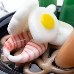 This small and heavy dab rig is stable and packed with noodly goodness. This cup-shaped rig has a long straw mouthpiece for concentrated flavor. It could work as a bubbler pipe also but we think it’s better as a rig. The ground joint has been reinforced to keep it from breaking and the additional noodles and veggies that pile on top make this piece stand out as a fun and collectible rig.